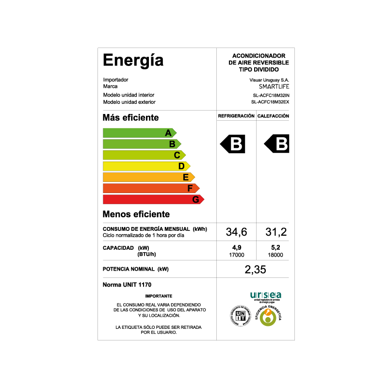 18000 BTUGas ecológico R32Eficiencia Energética BTemporizador combinadoTemperatura regulable: min.17º – max.30ºDisplay backlight (desactivable)Kit Instalación: 3 m. caños de cobreMedidas