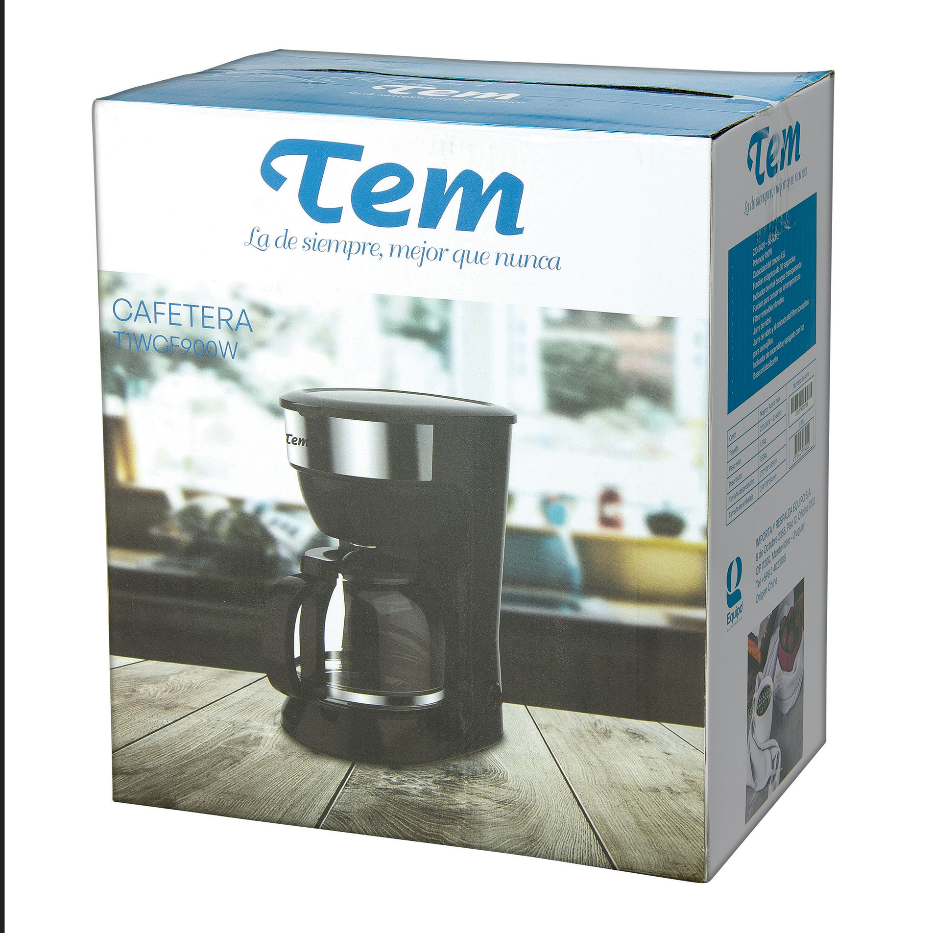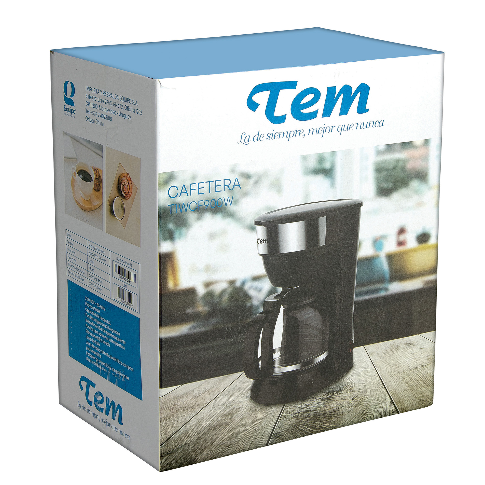 Marca: TEM Modelo: Cafetera por goteo TEM T1WCF900W7401Código: Z7400EAN: 4710447074002 Color: NEGRO Origen: CHINA Garantía: 12 MESES – Potencia de 900 W | 220-240V | 50-60Hz | Capacidad del tanque 1,5L | Función antigoteo de 30 segundos | Indicador de nivel de agua transparente | Función para conservar la temperatura | Filtro embudo removible y lavable en lavavajillas | Luz indicadora de encendido y apagado | Base antideslizante | Medidas 27 cm * 17,6 cm * 30,5 cm
