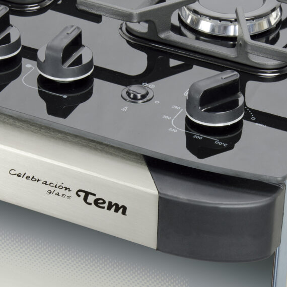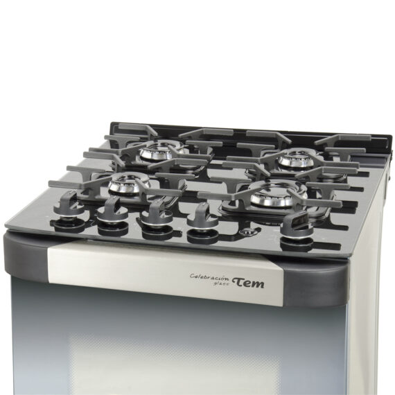 Marca: TEM Modelo: CELEBRACION GLASS 4HCódigo: Z2713EAN: 7890221027138 Color: PLATA Origen: BRASILGarantía: 12 MESES – GLP convertible a GN | Hornallas y rejillas individuales de hierro fundido | Mesada de cristal templado | Encendido electrónico | Medidas cocina (cm): Ancho 52 – Prof. 62 – Altura 95 | A supergas | Termocupla de seguridad en el horno | Grill eléctrico | Luz | Frente visor panorámico espejado | 2 parrillas autodeslizantes | Sistema Total Clean de 48 Lts. | Doble vidrio en la puerta | Medidas internas del horno (cm): Ancho 38 x Prof. 45 x Alto 36.3 | Horno: