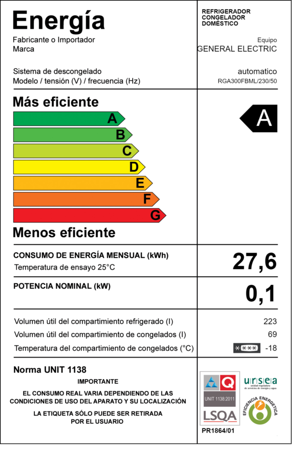 Marca: GENERAL ELECTRIC Modelo: REFRIGERADOR FRÍO SECO RGA300FBML C/ DISPENSADORCódigo: Z5707EAN: 7704712171968 Color: ACERO INOXIDABLE Origen: COLOMBIAGarantía: 12 MESES – CAPACIDAD Bruta: 300 Litros. | CAPACIDAD Neta:292Litros. | CAPACIDAD: Refrigerador 223 Litros. | CAPACIDAD: Freezer 69 Litros. | Frío seco | Acero inoxidable | Dispensador de agua con tanque de 2 Lts. | Luz interior LED | 2 estantes de cristal templado ajustables | 1 cajón para frutas y verduras | 1 cajón para carnes y fiambres | 4 anaqueles en puerta | 1 estante de cristal templado | Fábrica de hielosIce Twist | 1 anaquel en puerta | Dimensiones: Ancho 60 x Prof. 69,5 x Alt. 177,5 cm. | En refrigerador: | En freezer | Para mayor precisión ver productos en el local comercial